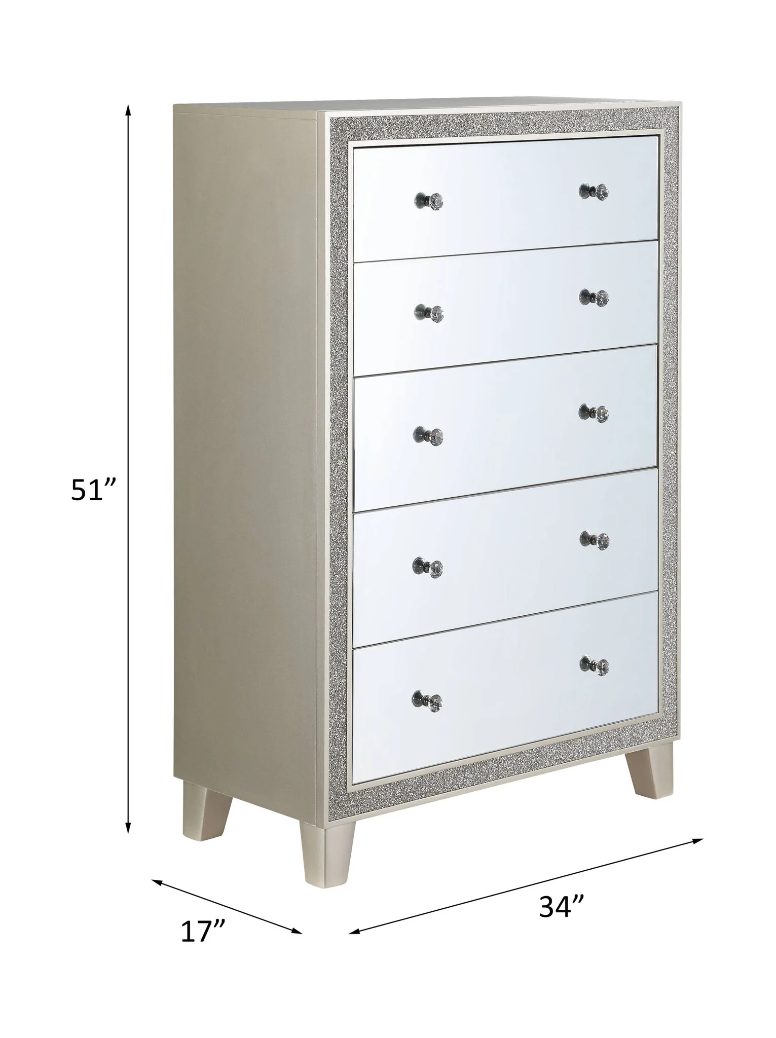 - Elegant Design: The Sliverfluff Mirrored & Champagne Finish Chest features a stylish mirrored front drawer and acrylic accents, combining modern elegance with practical storage solutions.